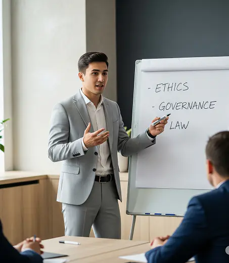 Этот предмет охватывает профессиональную этику, честность, подотчетность и принципы эффективного корпоративного управления. Вы также получите базовые знания в области контрактного права, трудового права и корпоративного права, что поможет вам понять правовую среду, в которой работает бизнес.
